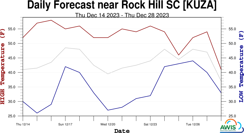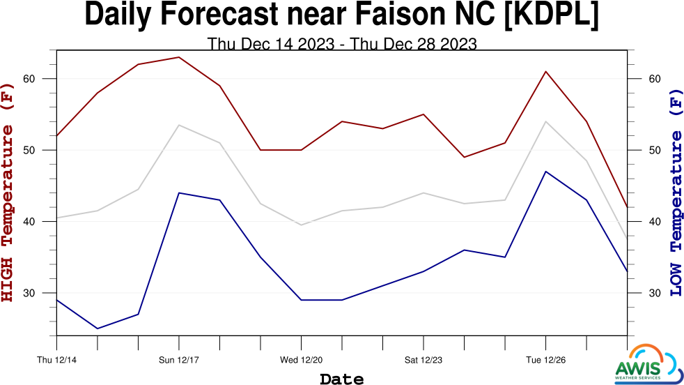 Now Available - AWIS just added a 15 day forecast graph for client requested locations. (You get to tell us where you need this graph created for.) The Forecast Graph shows 15 day expectations for Max Temperature, Min Temperature, and Average Temperature.