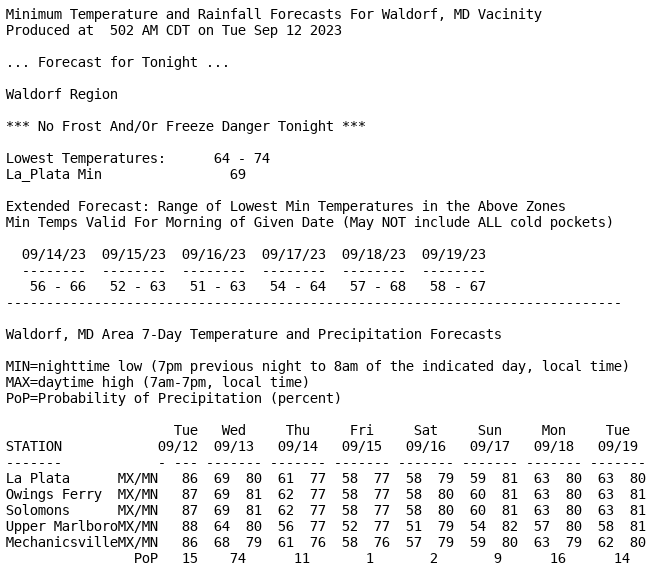 2. Localized cold protection information including anticipated temperature and duration at various critical threshold ranges. Hourly forecast parameters are included for winds, dew, wetbulb temperatures, clouds, and precipitation to help determine cold protection needs.