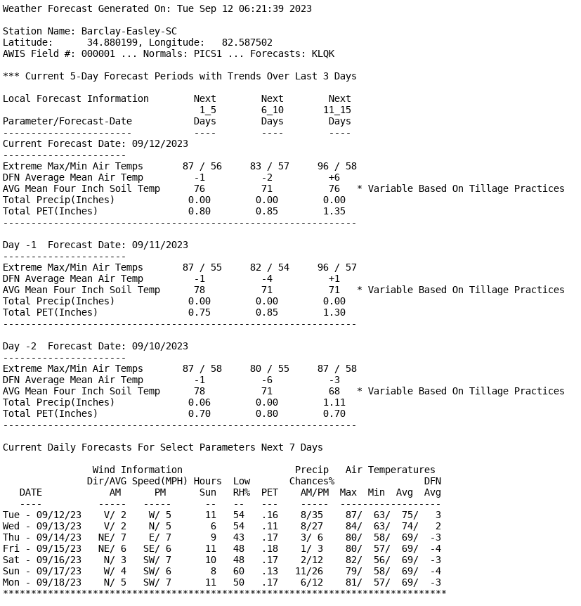 3. Localized daily agricultural weather forecast covering 1-15 days out. Hours of sunshine expected, solar radiation totals, Evaporation, GDD units, Rain Amounts, Wind information, and other critical parameters can be included.